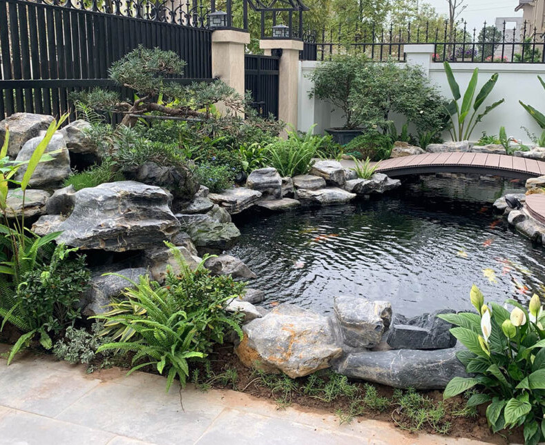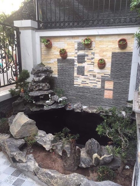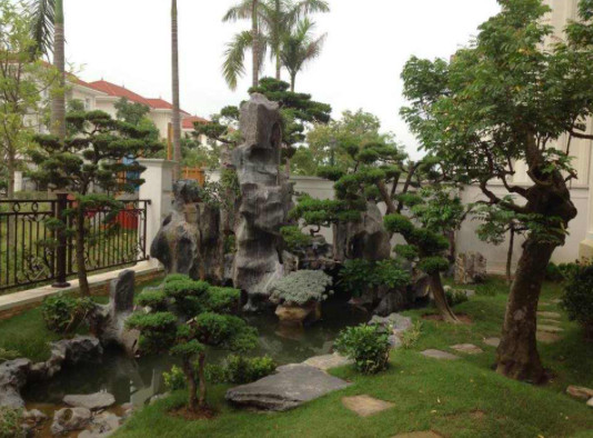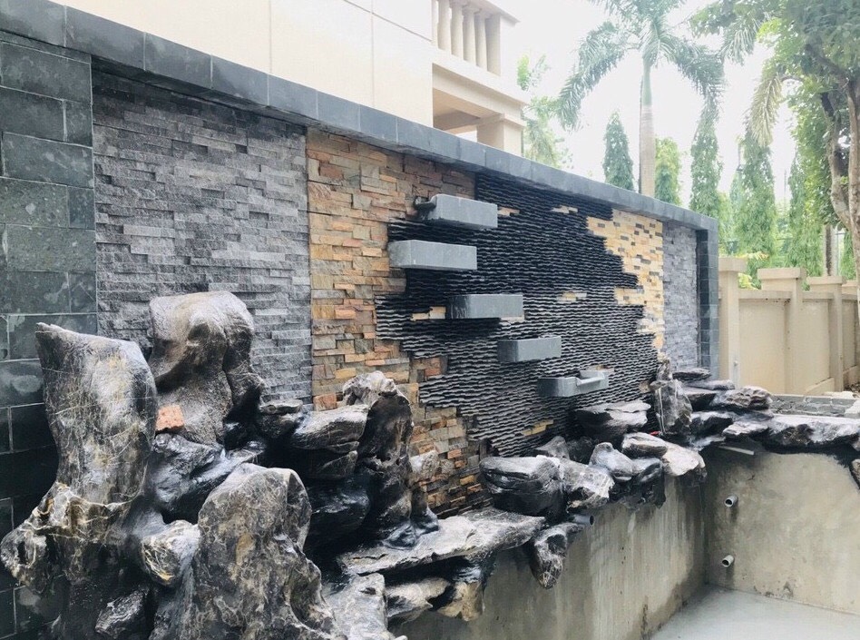 Với những không gian có diện tích sân vườn lớn rất thích hợp để thiết kế thác nước cùng hòn non bộ với chất liệu từ đá lũa đen. Đây sẽ là điểm thu hút và góp phần tạo không gian thêm phần xanh mát.